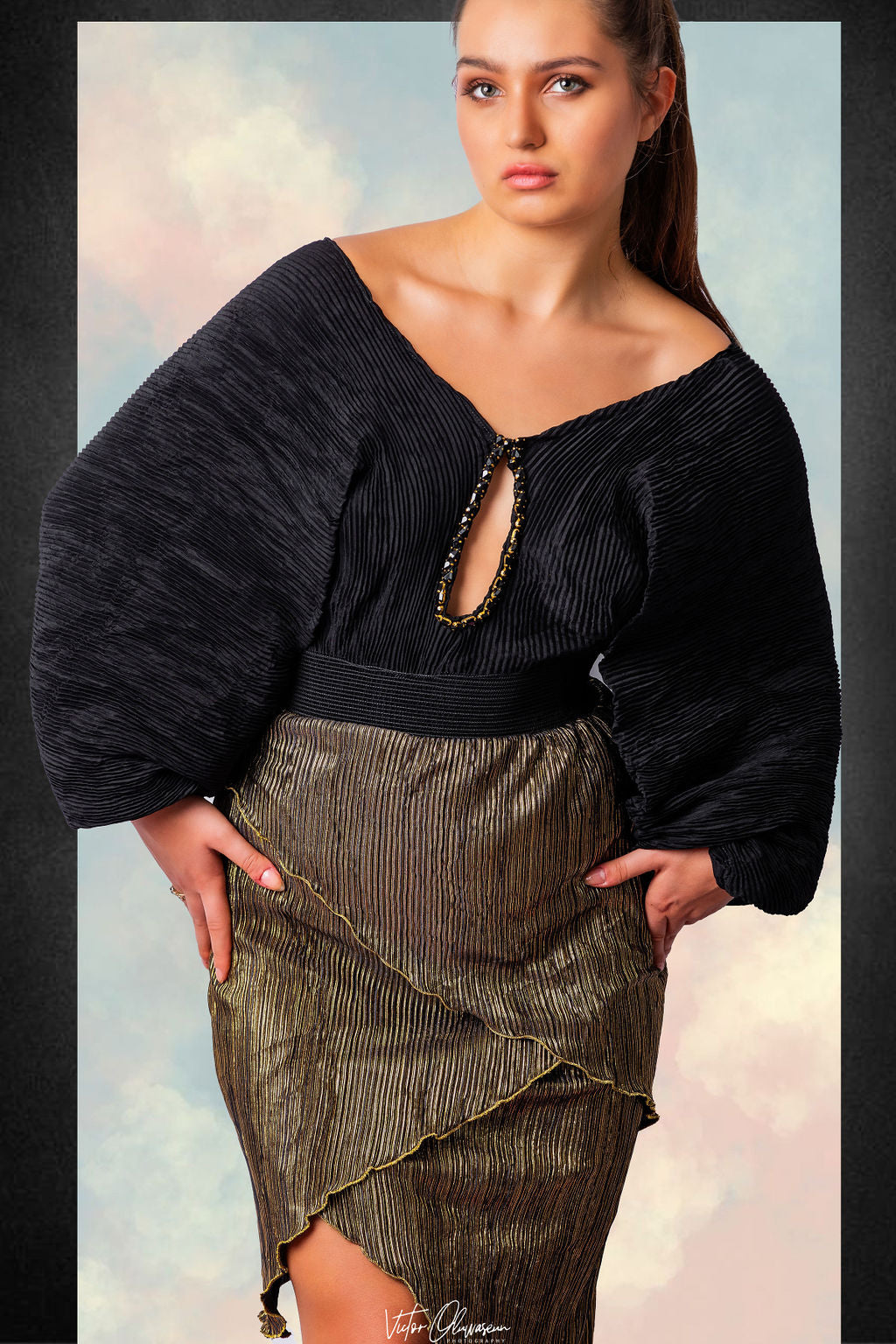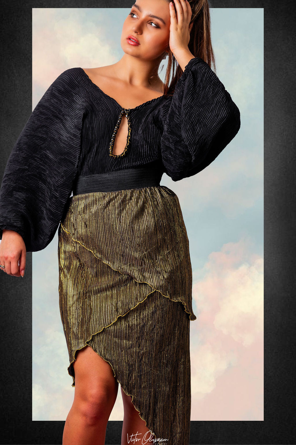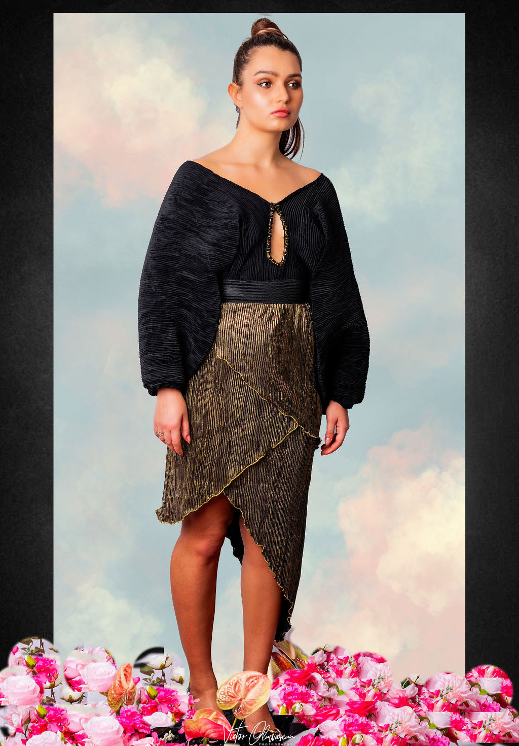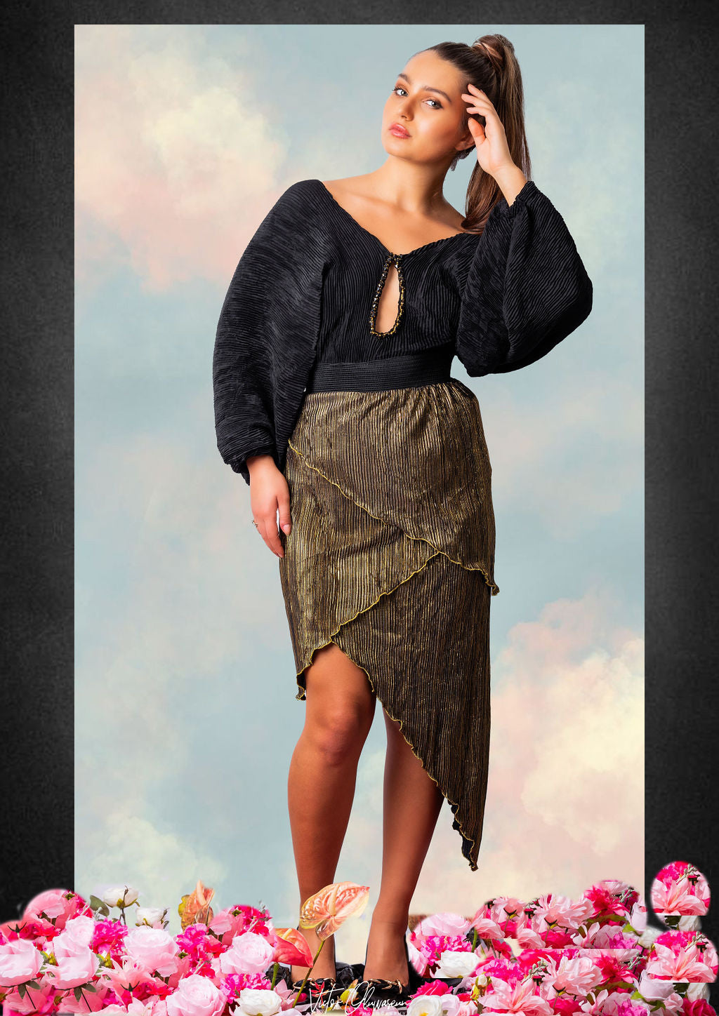 ASHA is a Black and gold layered skirt, it features 3 asmmetric layers of a lustrous plisse fabric with neatly finished gold overlock trim.