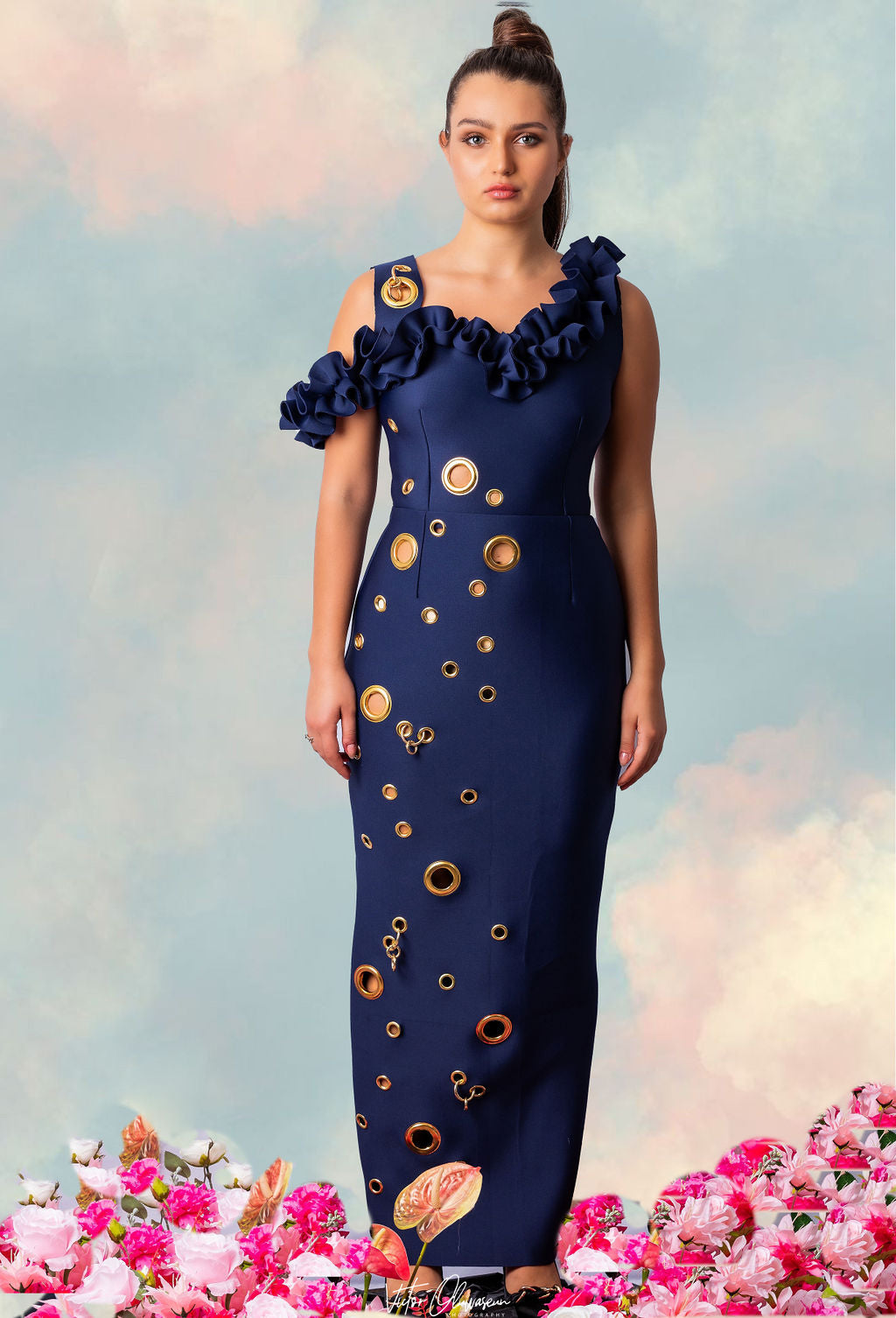 The VIV dress is an elegant long-length dress that features a sweetheart neckline. It is detailed with two different sizes of gold-plated metallic eyelet designs running through the dress. The neckline is also detailed with a ruffle trim that drops to a cold shoulder from one sleeve.